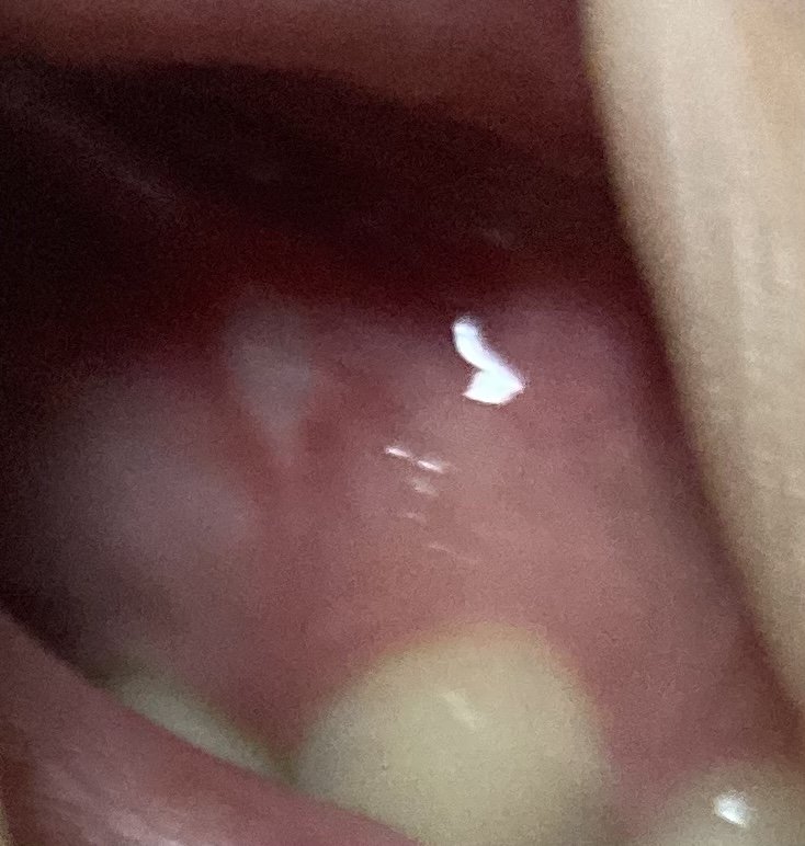 구내염의 가지 수에는 첫 번째로 궤양의 종류인 아프타성 궤양이 있어요. 뺨과 혀, 입술 안쪽에서 생기는 붉은 고리 속 옅은 노란색 궤양의 형태를 보입니다.