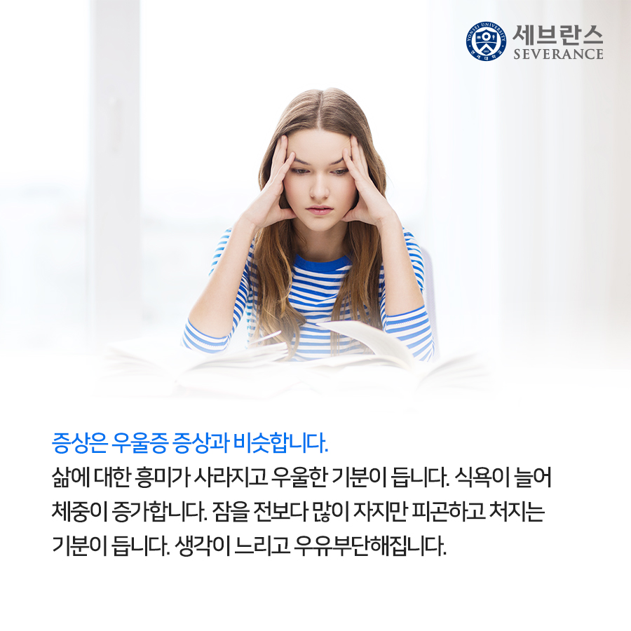 -식욕 부진, 폭식 장애, 체중 또는 불면증 혹은 과수면증.