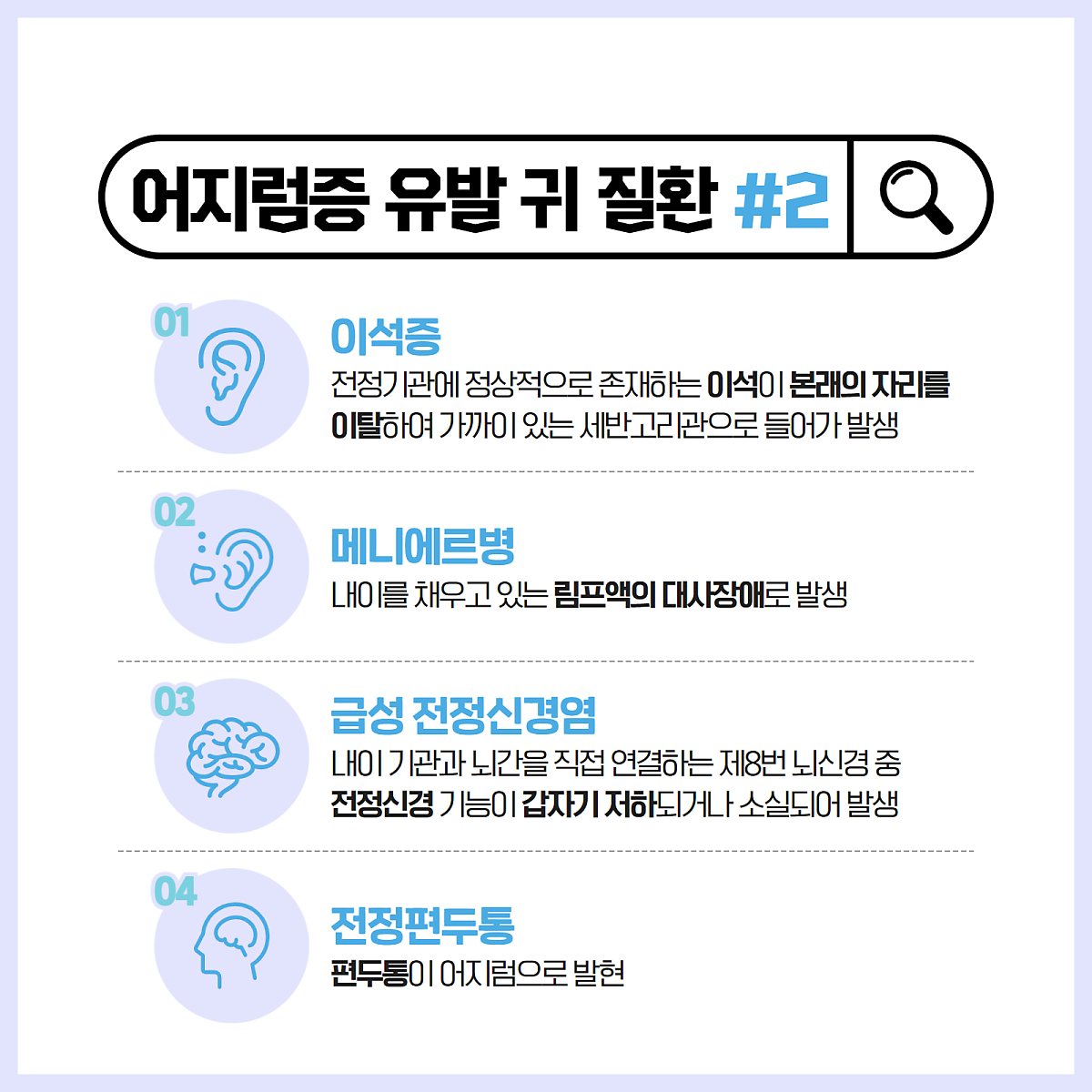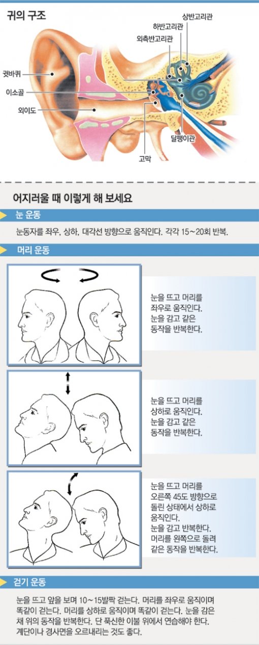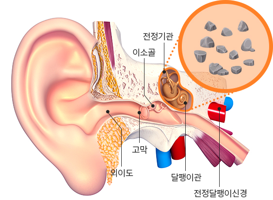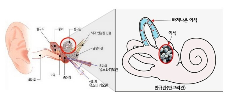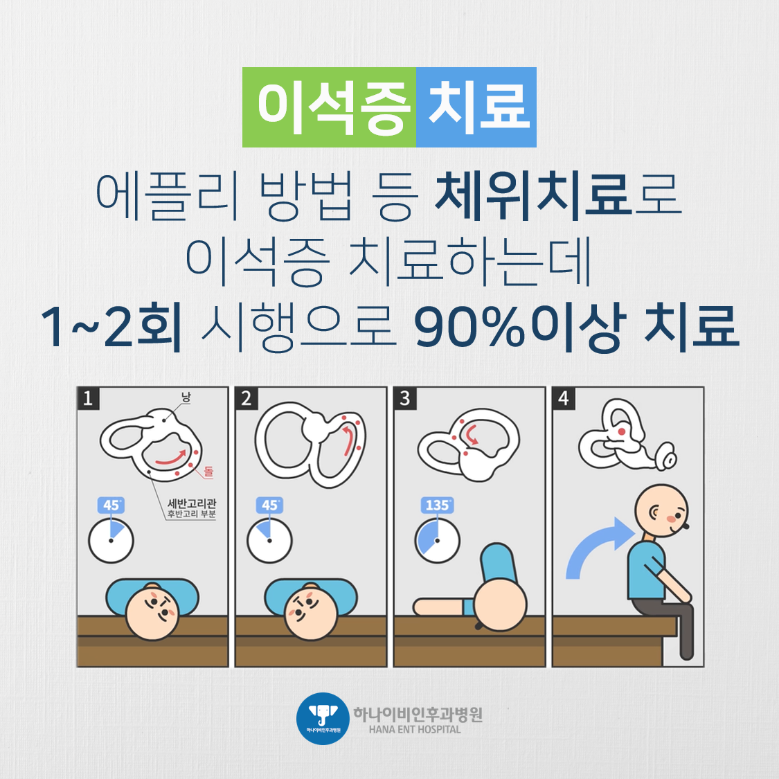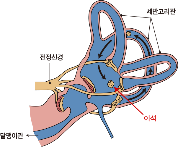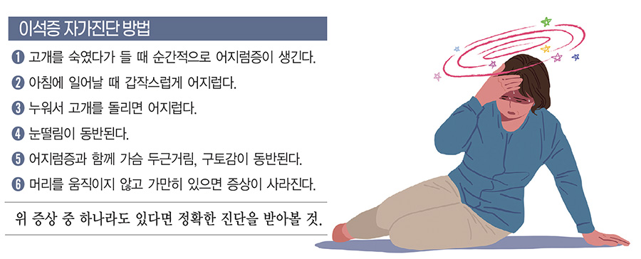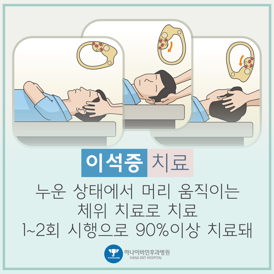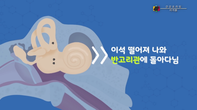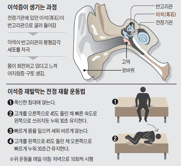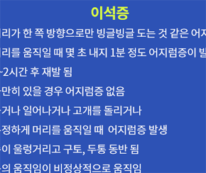 이석증이란 귀 안의 퇴행성 조직파편인 이석이 감퇴하여 나와 귓속 평형기관을 자극해 어지럼증이 출현하는 질환으로 1분 미만의 시간 동안 빙글빙글 도는 현상이 있으면하는 이석증일 가능성이 높다.