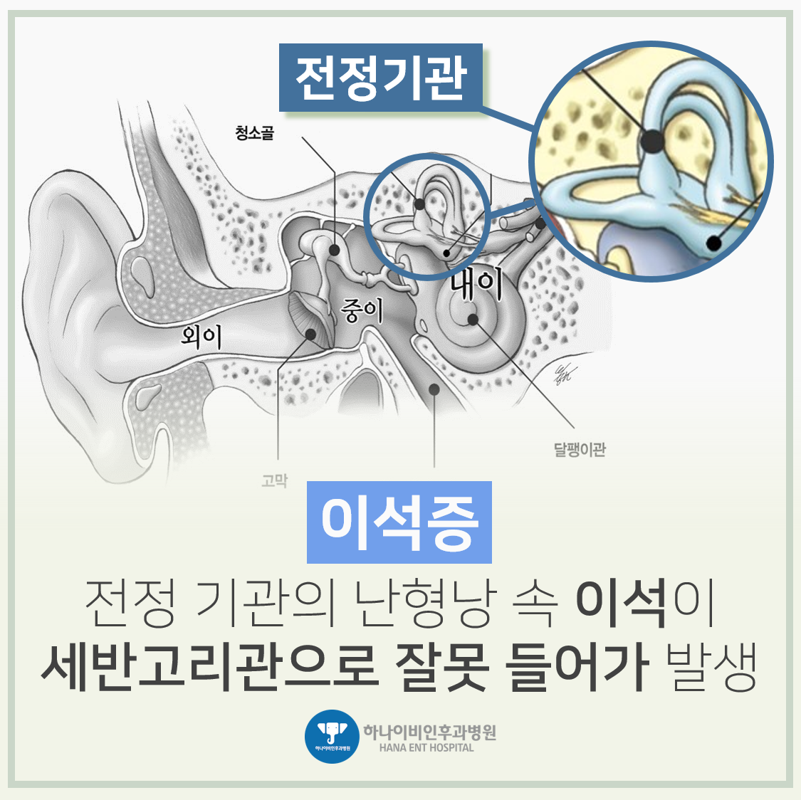 이석증의 원인은 알 수 없는 경우가 제일 높지만, 귓속 전정기관 안에 있어야만 한 이석 조각이 쇠퇴하여 세 반고리관으로 잘못 들어가서 어지러움이 생성되기도 하며, 두부 외상, 전정 신경염, 메니에르병, 귀 수술, 비 이과적 수술 등이 원인으로 작용할 수 있어요.